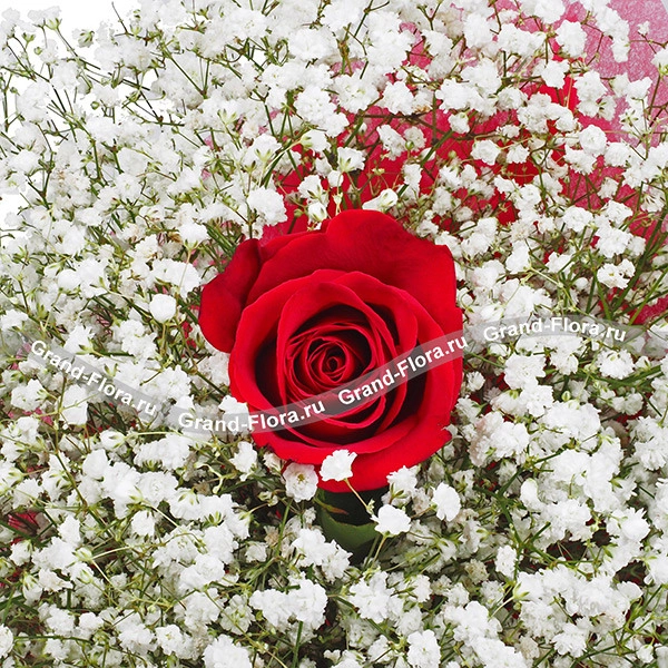 Уменьшенный: роза красная - 1 шт, гипсофила - 3 шт, фетр розовый. Примерный диаметр  букета 20х20 см.