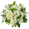 Уменьшенный: роза белая - 1 шт., альстромерия белая - 3 шт., эустома белая - 3 шт., салал, сетка зеленая. Примерный объем букета 25х25 см.
