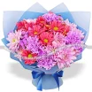 Люкс: гвоздика фиолетовая - 8 шт., хризантема кустовая красная - 4 шт., хризантема кустовая фиолетовая - 5 шт., статица, упаковка, лента.