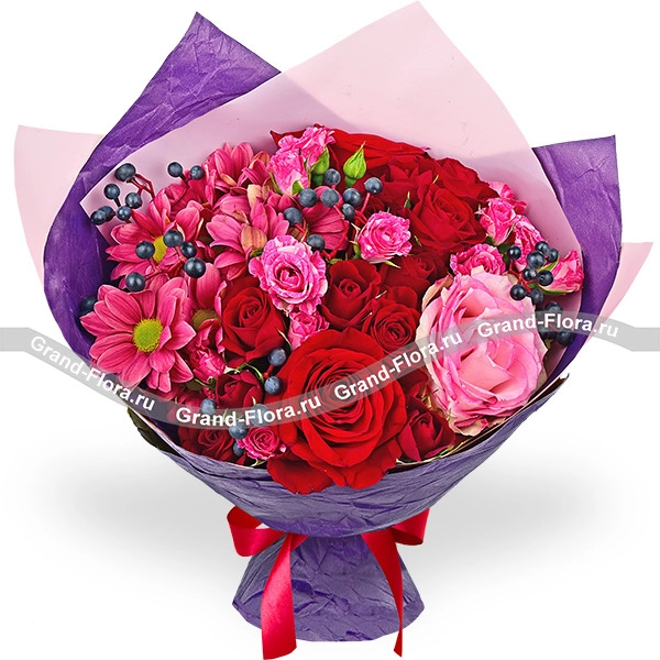 Стандартный: роза красная - 2 шт., роза кустовая красная - 2 шт., роза кустовая розовая - 3 шт., хризантема кустовая ромашковая розовая - 2 шт., декор, упаковка, лента. Примерный размер: 30Х30 см.