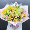 Букет состоит из альстромерии, которую еще называют перуанской лилией из-за внешнего сходства, разнообразное цветовое сочетание, в окружении декоративной зелени. Диаметр букета от 25см до 50см, в зависимости от выбранного варианты букета.  Букет перевязан изящным розовым бантом. Обращаем Ваше внимание, что состав и оформление букета может отличаться.