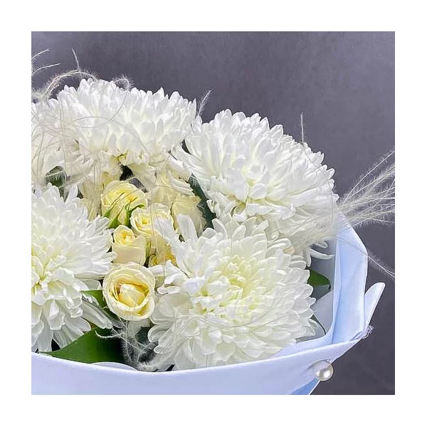 Элегантный букет из белых хризантем и роз- это классическое, но в то же время современное цветочное произведение, которое никогда не потеряет своей актуальности и всегда будет радовать изысканной и такой нежной красотой.