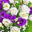 Нежное сочетание белых и сиреневых эустом выигрышно подчеркивает гипсофила и декоративная зелень. Букет, помещенный в изящную корзину, станет безупречным решением для вручения дорогому человеку на праздник.